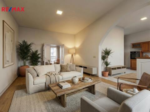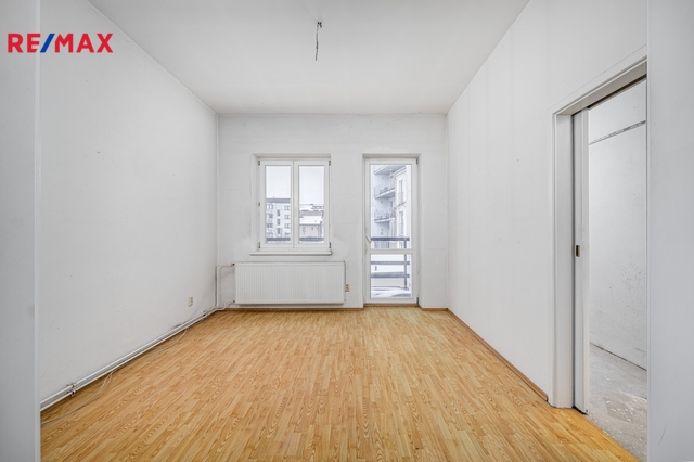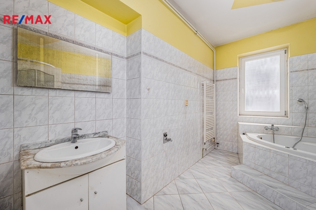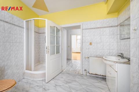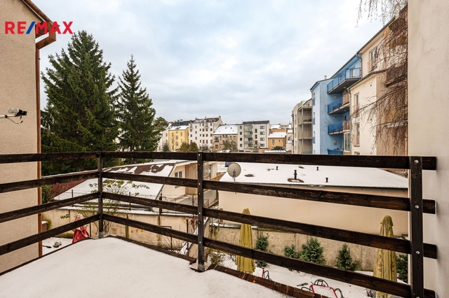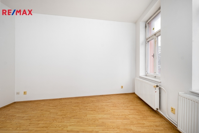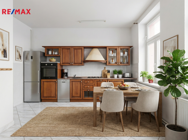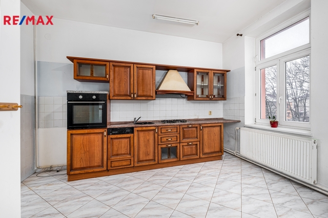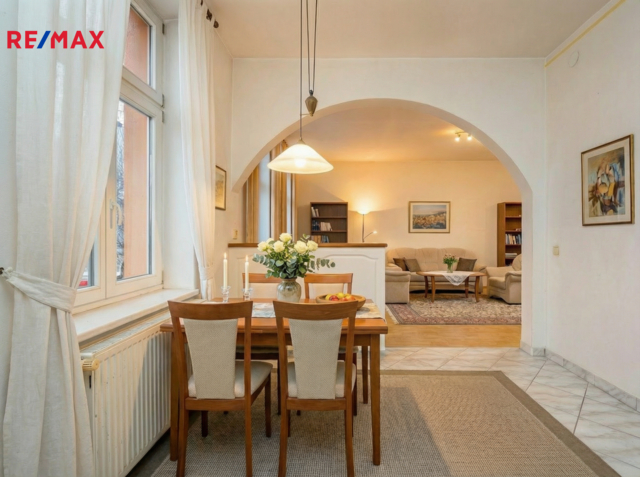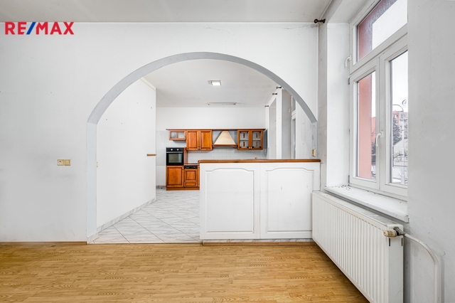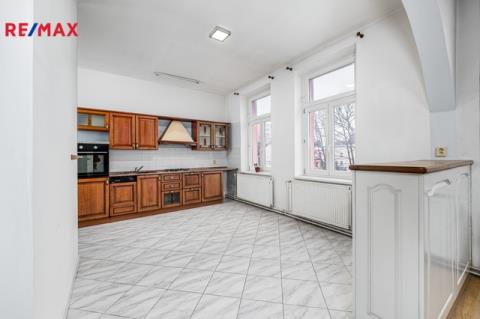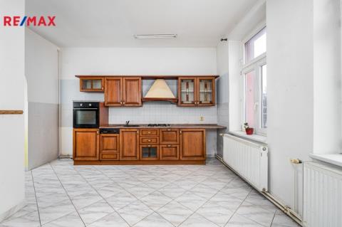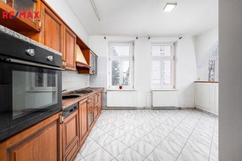 V patře domu se nachází bytová jednotka o dispozici 3+kk, 121 m2, která je vyklizená a nezařízená, připravená k okamžitému využití či úpravám dle potřeb nového majitele. Dominantou bytu je prostorný obývací prostor propojený s kuchyní a jídelnou. Byt dále nabízí ložnici se vstupem na balkon, další samostatný pokoj orientovaný do ulice, dvě komory a šatnu poskytující dostatek úložného prostoru. K dispozici je velká koupelna se sprchovým koutem, WC a rohovou vanou. Byt má vlastní vytápění pomocí kotle a samostatné měření.