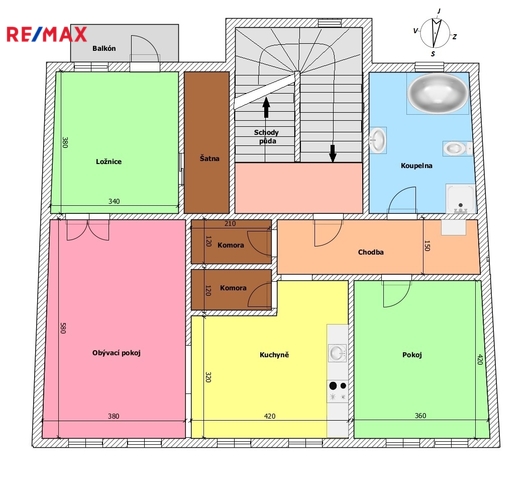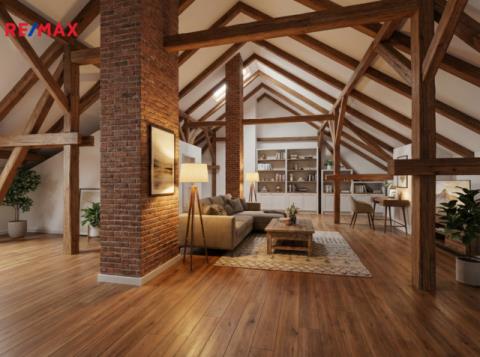 Dalším velkým benefitem je podkroví (půda) 121 m2, které je v současnosti využíváno jako úložný prostor, avšak nabízí výrazný potenciál k vestavbě dalších bytových jednotek, ateliéru či rozšíření obytné plochy.