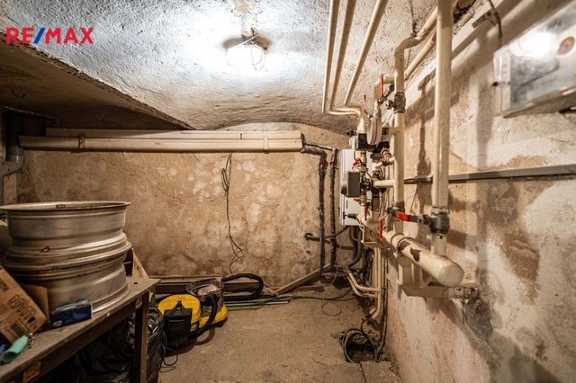 Dům je celopodsklepený, sklepní prostory zahrnují technické zázemí včetně kotle, který zajišťuje vytápění - aktuálně podlahové vytápění baru i dalších místností pomocí radiátorů. Sklep je členitý a zahrnuje možnost rozdělit jej na 7 samostatných sklepních kójí pro každou bytovou jednotku.