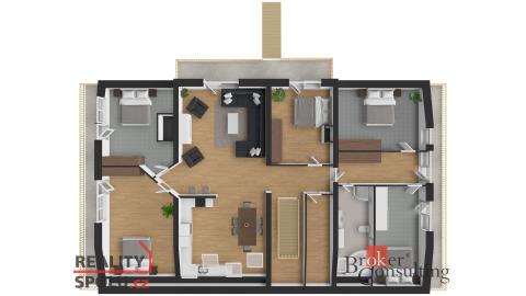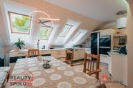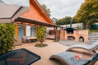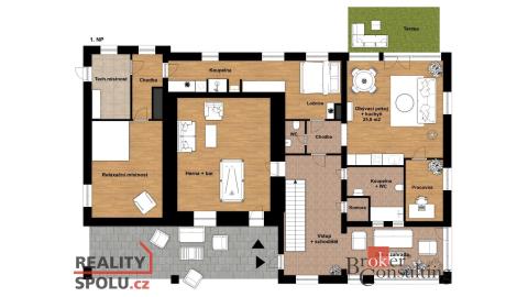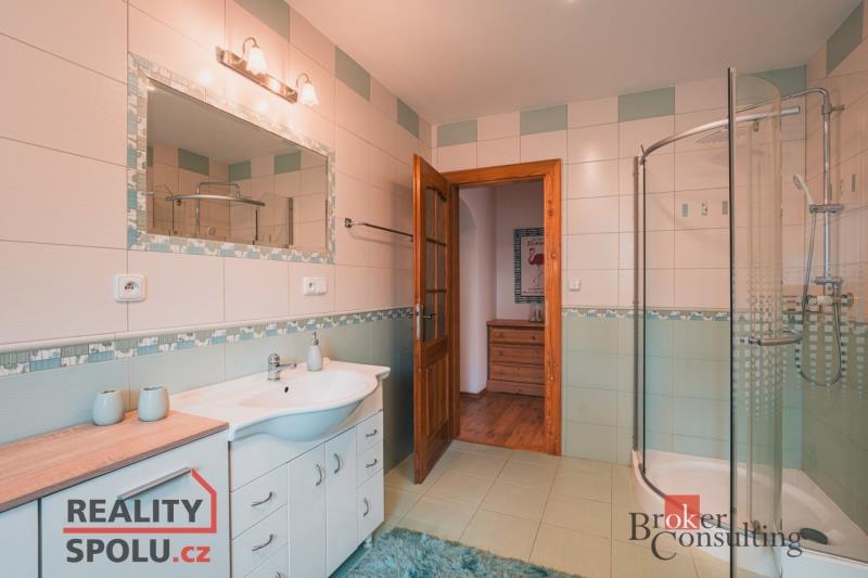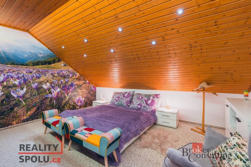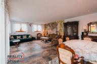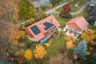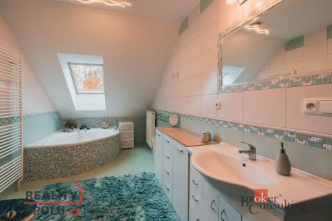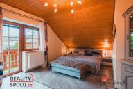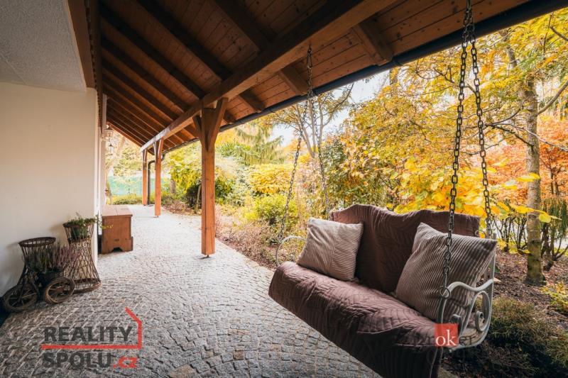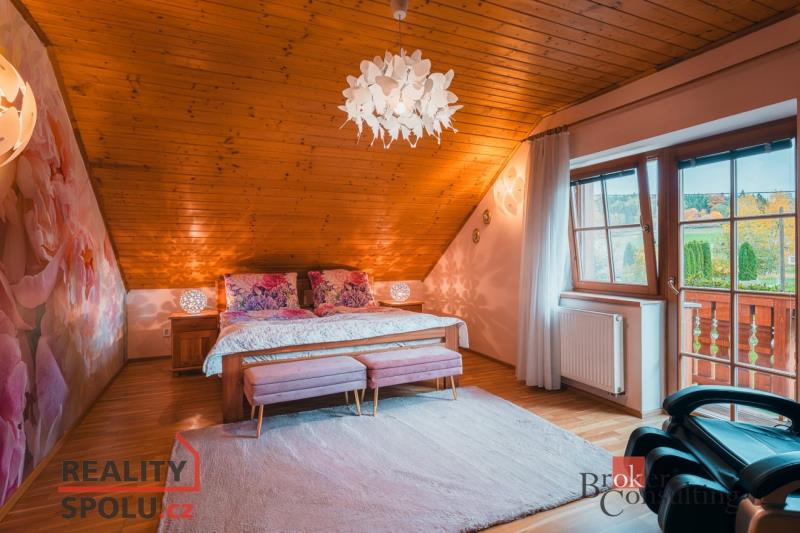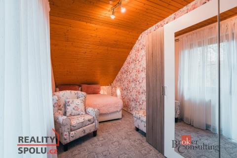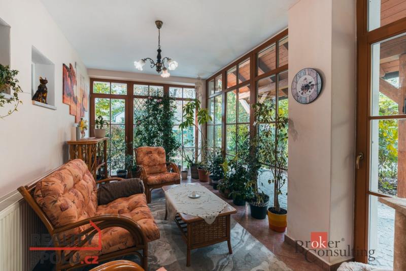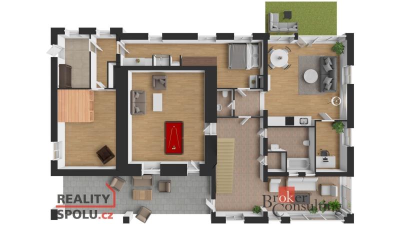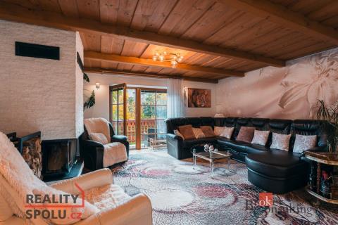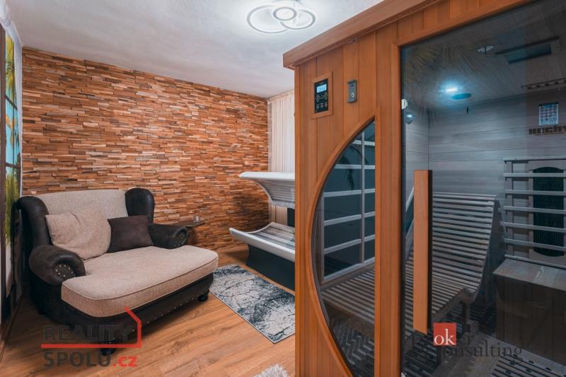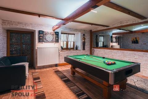 Rodinný dům, disponující dvěmi samostatnými bytovými jednotkami. V přízemí domu je prostorná vstupní hala, na kterou navazuje zimní zahrada, byt s dispozicí 3+kk, ke kterému patří i relaxační pokoj vybavený saunou a soláriem, a odpočinková místnost s kulečníkovým stolem, mixážním pultem a šipkami. V patře se nachází prostorný obývací pokoj s luxusním kuchyňským koutem a krbem. Dále 5 ložnic, koupelna, Wc. Z obývacího pokoje se vyjde na prostornou terasu se schody mířícími do zahrady.