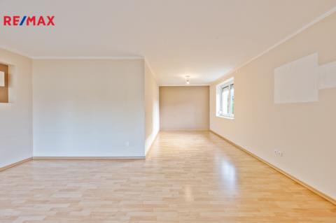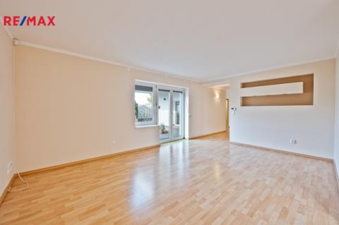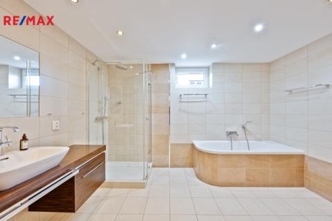 Z obývacího pokoje i kuchyně se dá přímo vstoupit na prostornou, částečně zastřešenou terasu (37 m2), která je přirozeným pokračováním domu. Terasa plynule navazuje na slunnou část zahrady s bazénem, kde se hezky propojuje dění uvnitř i venku.