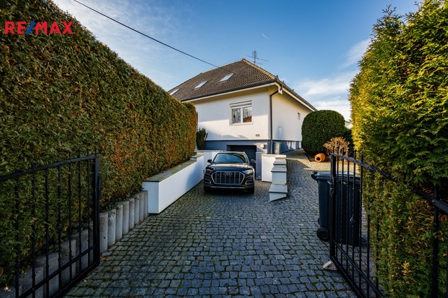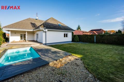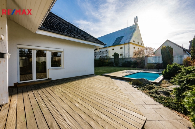 Součástí domu je udržovaná, plně oplocená zahrada, která nabízí ideální kombinaci soukromí, klidu a prostoru pro rodinný život. Dominantou je zapuštěný bazén s dřevěnou terasou, ideální pro letní dny i dětské radovánky.