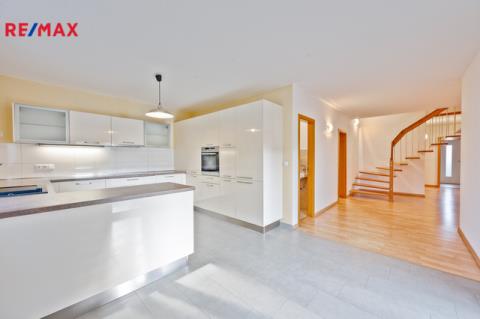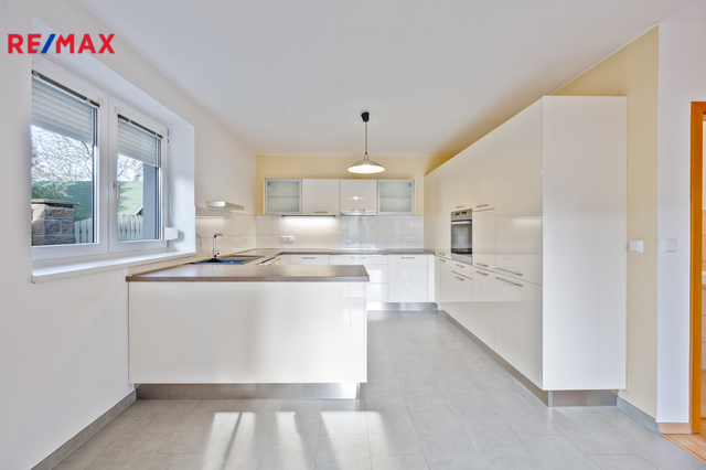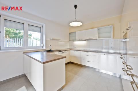 Dům je vybavený moderní kuchyňskou linkou s praktickým ostrůvkem a vestavenými značkovými spotřebiči (lednička s mrazákem, myčka, el. varná deska, digestoř, el. trouba). Ve všech obytných místnostech je nainstalovaná plovoucí podlaha, v koupelně, WC, technické místnosti a v kuchyni je položena dlažba.