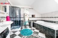 1.patro - na konci schodiště je hala, odtud vstup do hlavní koupelny s vanou a sprchovým koutem, jedna ložnice se vstupem na balkon a druhá ložnice je také se vstupem na balkon, třetí ložnice je upravená na posilovnu se saunou, vedle je samostatné WC. Celkem je v domě 9 místností, dvě koupelny, zimní zahrada.