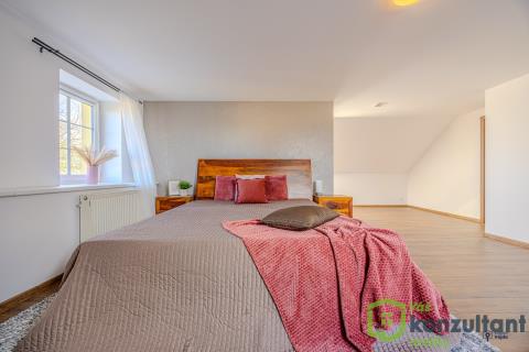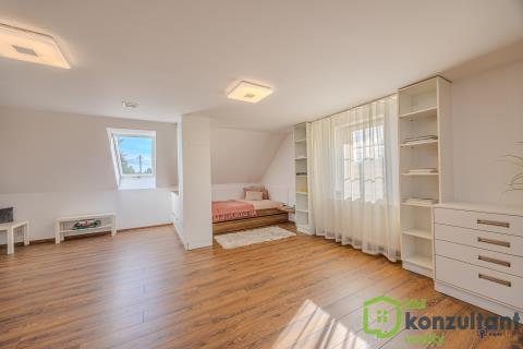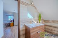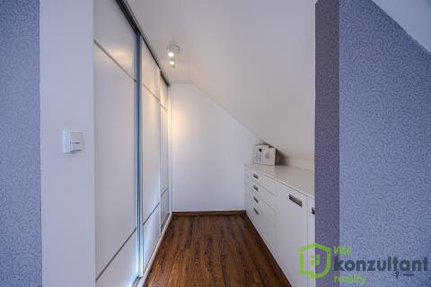 V přízemí veranda s WC, dva pokoje, obývací pokoj s kuchyňským koutem a koupelna s WC. V podkroví potom dva velké pokoje s rozlohou přes 35 m2, každý s vlastní šatnou. Jedna z ložnic s vlastní koupelnou, WC.