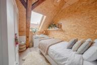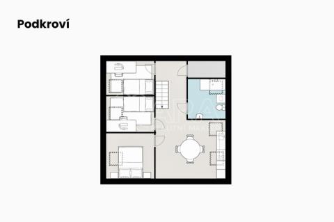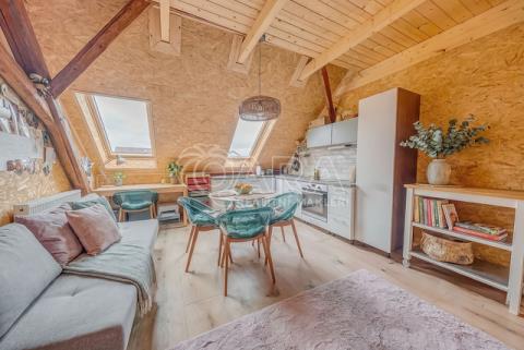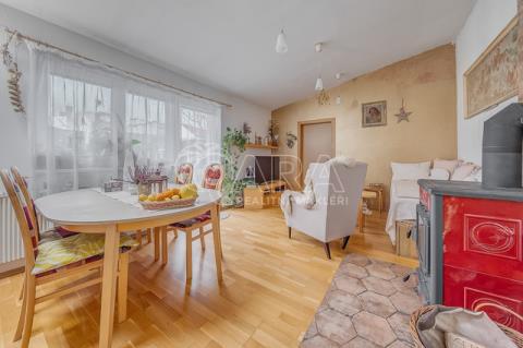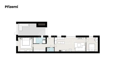 Dispozice: 1. NP - zádveří, prostorný obývací pokoj s kuchyňským koutem (33,2 m2), dvě ložnice (15,5 m2, 12,3 m2), chodba, koupelna a samostatné WC.