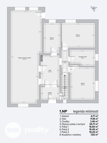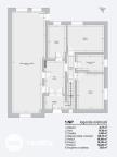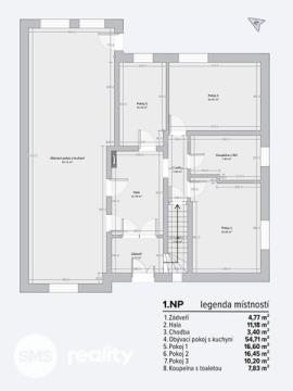 1. NP: vstupní zádveří, hala, obývací pokoj s kuchyňským koutem včetně značkových spotřebičů BOSCH, tři samostatné pokoje a nová luxusní koupelna s toaletou a sprchovým koutem typu walk-in.