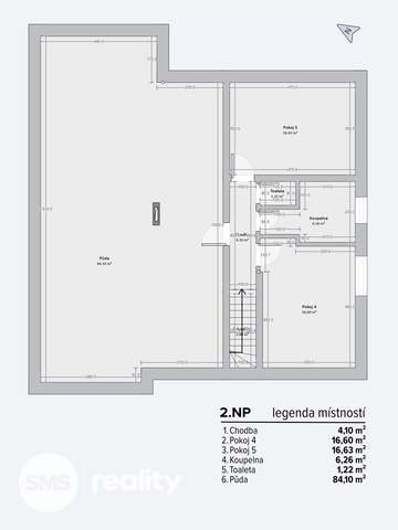 2. NP: chodba, dva pokoje, koupelna, samostatné WC a půdní prostor o ploše 84 m², vhodný k vestavbě dalších pokojů.
