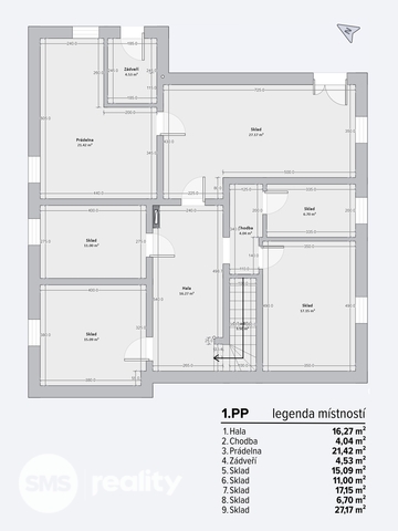 1. PP: hala, chodba, prádelna a několik skladových místností o celkové ploše 123,37 m², vhodných pro dílnu nebo technické zázemí.