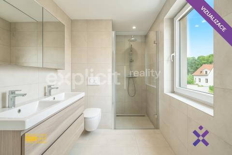 V přízemí se nachází předsíň, prostorná chodba, kuchyň s jídelním koutem a vstupem na velkou terasu, obývací pokoj, ložnice a dvě koupelny. Jedna se sprchovým koutem a toaletou, druhá s vanou. Samostatné WC pak přidává ještě více komfortu.