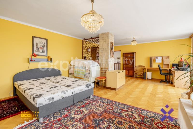V patře jsou další dva pokoje a kuchyň. Prostor pro rodinu s dospělými dětmi, hosty nebo pro vybudování samostatné bytové jednotky. Jeden z pokojů má balkon, z chodby je vstup na zastřešenou terasu s výhledem do zahrady.