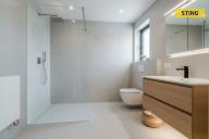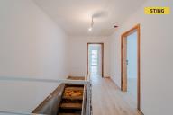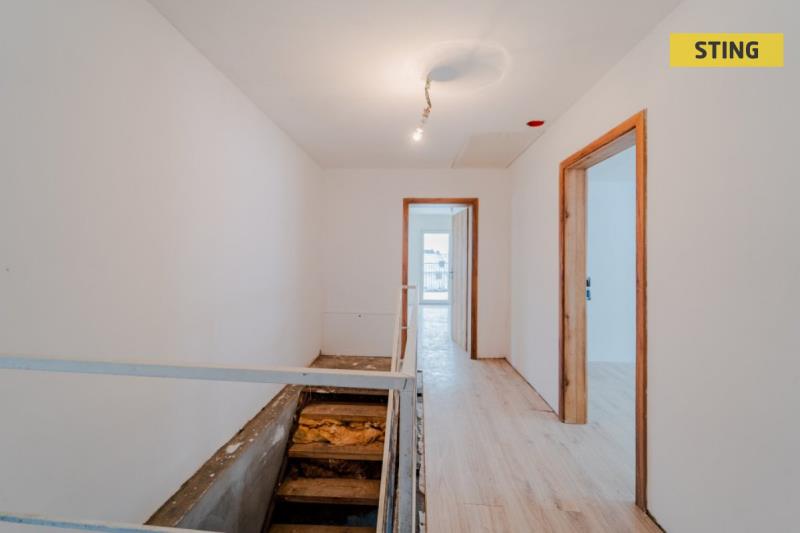V patře se nachází samotné srdce domácnosti, a tím je obývací pokoj s kuchyňským koutem, kde opět uplatníte svou fantazii pro jeho a výstupem na jihovýchodně orientovanou terasu, kde káva při východu slunce bude mít romantický nádech. Dále jsou zde 2 pokoje (ložnice, dětský pokoj) a koupelna s vanou a umyvadlem. Z chodby je řešen vstup na půdu prostřednictvím skládacích půdních schodů.