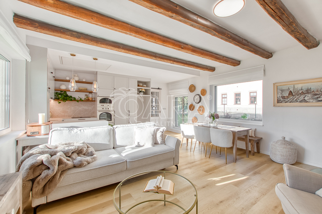 Interiér je navržen s ohledem na maximální využití prostoru a elegance. Hlavní obytná část s kuchyňským koutem je srdcem domu. Kuchyně je v laku, vyrobená na míru a vybavená kvalitními vestavnými spotřebiči.
