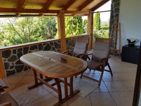 Na zahradě se nachází ovocné a okrasné stromy a keře, různého druhu a stáří a také pergola s krbem.