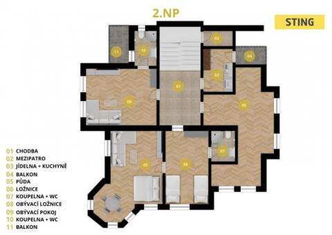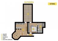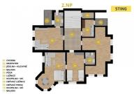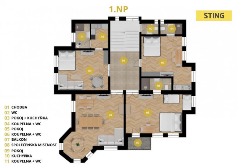 Dispozice domu je následující: V přízemí je velká společenská místnost pro 25 lidí s kuchyní, kancelář, sauna, koupelna s WC, technická místnost. V 1.NP je prostorná vstupní hala, 3 ložnice s vlastní koupelnou, toaletou a kuchyňským koutem, balkon. Ve 2.NP je pokoj s koupelnou a toaletou, kuchyně s balkónem, samostatný apartmán 2+kk a půda.