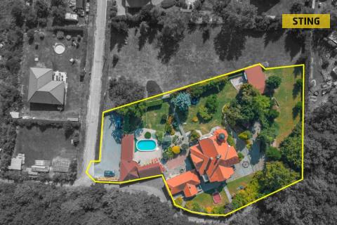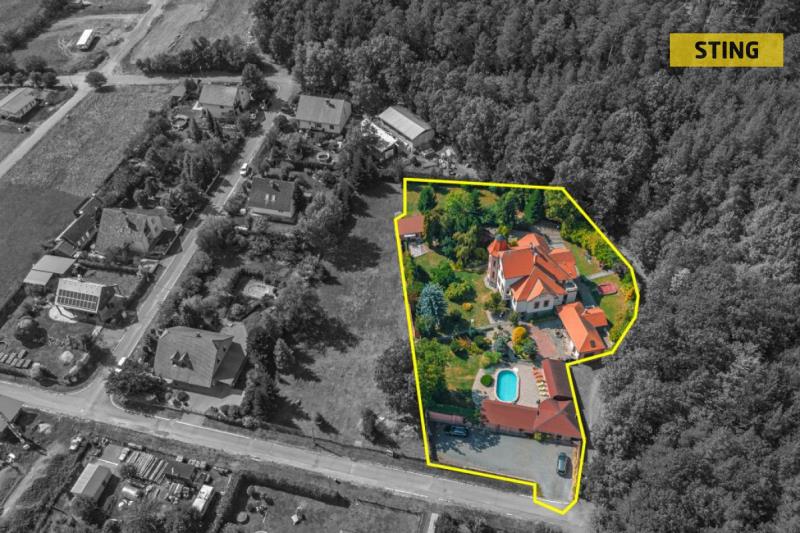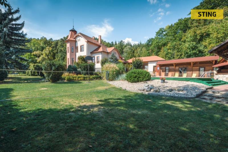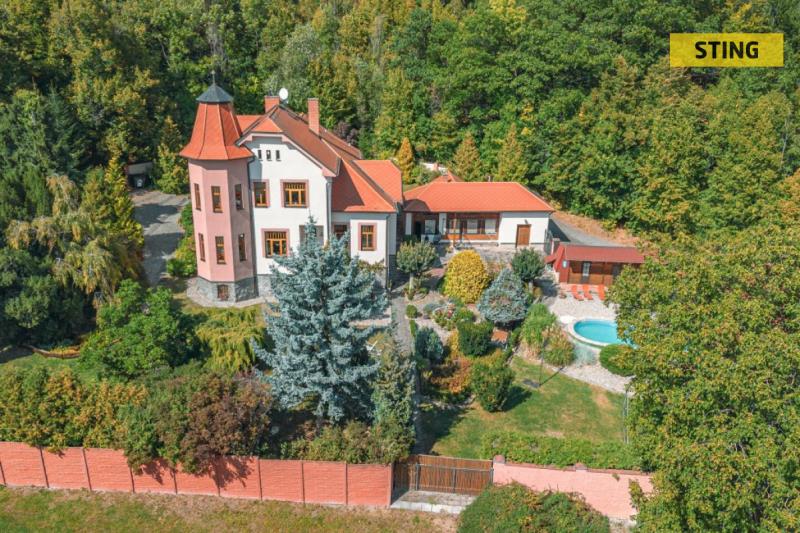 Příslušenstvím nemovitosti je vlastní parkoviště, prostorná samostatně stojící garáž s technickým zázemím, bazén, letní kuchyně s grilem a prostornou krytou pergolou vhodnou k rodinným oslavám či posezení s přáteli, ve vedlejší přístavně je klubovna, krytá terasa, dále sklad dřeva, kolárna. Děti ocení pískoviště či zahradní kolotoč. K domu náleží vzrostlá okrasná zahrada o výměře 2423 m2 s mnoha zákoutími, altánem a místy ke klidnému posezení. Dostatek klidu a soukromí zajistí samotné umístění domu v klidné okrajové části obce a vysoké zděné oplocení pozemku. Bezpečnost objektu zajišťuje nainstalovaný kamerový systém. K domu je možné dokoupit samostatný navazující pozemek o výměře 2207 m2 a stavbu tak rozšířit dle potřeb budoucích vlastníků.