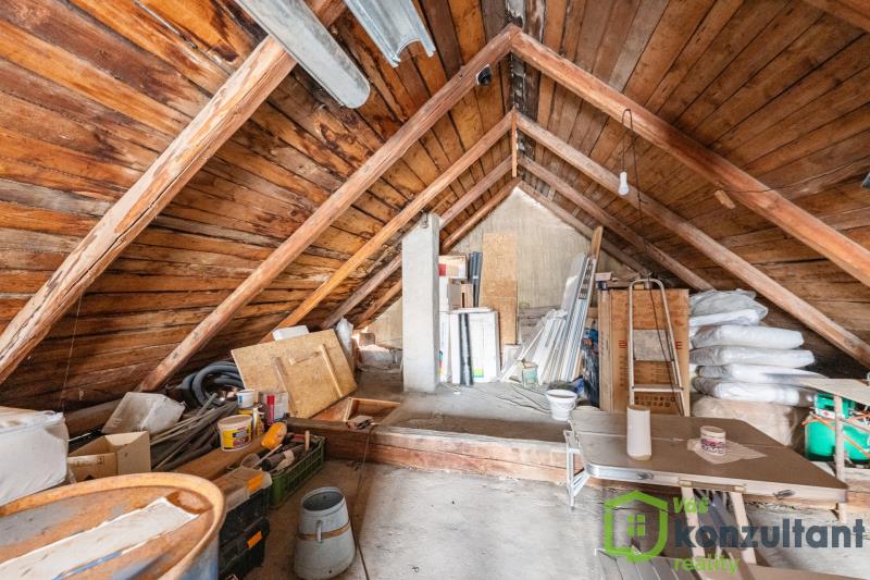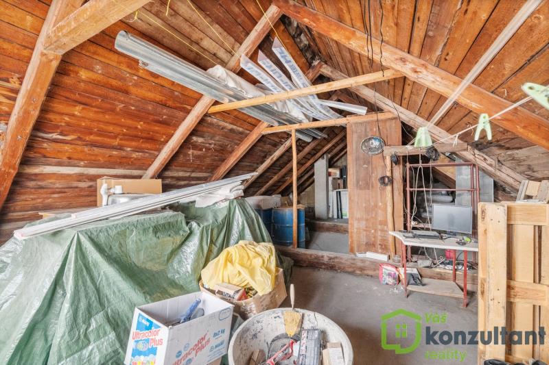 Podkroví je aktuálně využitelné jako sklad. Prostor lze dodatečně snížit sádrokartonem a zateplit, aby se nevytápěl nevyužitý objem. Elektroinstalace je zde rovněž připravena.
