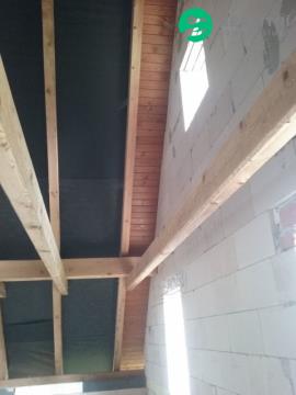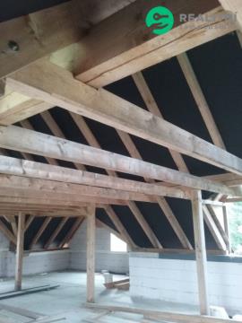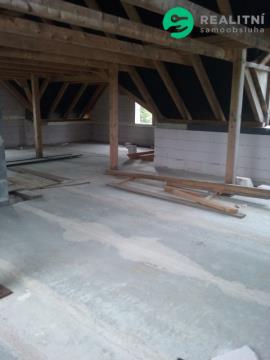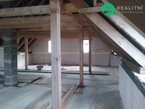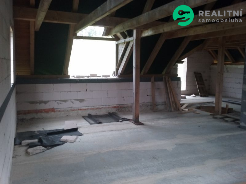 1PP (částečně odkryté – mírný svah), 1NP, podkroví, obytná půda. Stavba je z keramických tvarovek s plánovaným zateplením. Stropy Spirol, vnější úprava dle projektu kombinace bílé omítky a dřevěného obkladu s možností změny před dokončením. Střecha s plechovou krytinou (r.2023) 10 let záruka. Podzemní části jsou zatepleny XPS 10 cm a chráněny dvouvrstvou SBS hydroizolací. Komín je stavebnicový s nerezovou vložkou. Interiérové tesařské konstrukce střechy s již hoblovanými vodorovnými nosníky (kleštiny) a podpěrnými trámy, plánované jako pohledové; podbití přesahů střechy na všech štítech hotové s povrchovou úpravou. Dispozice interiéru není dokončena, lze upravit dle vlastních potřeb.