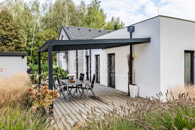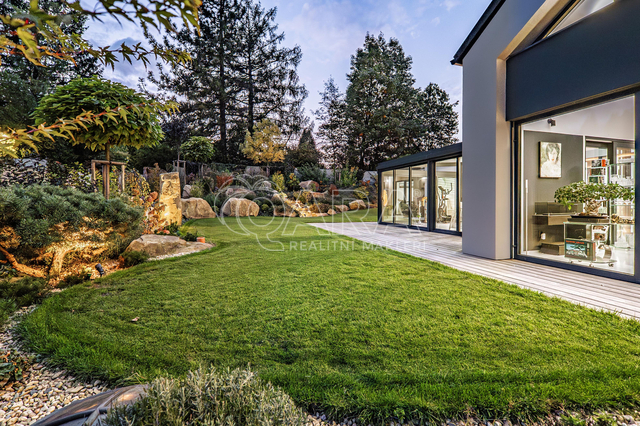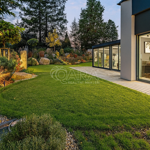 Zprostředkujeme Vám ke koupi moderní, reprezentativní, designový, maximálně funkční vilový bungalov (dřevostavba) s obytnou plochou 145 m2, se zimní a architektonickou zahradou, situovaný v nejprestižnější části Kamenice – Štiřín, v klidové zóně u zámku a golfového hřiště. Tento výjimečný dům je vystavěn na pozemku o celkové ploše 1 205 m2 a byl kolaudován v roce 2023. Dominantou stavby je originální ručně malovaná fasáda od akademického malíře, která domu dodává naprosto jedinečný charakter a činí jej skutečným designovým originálem. Parcela je bez přímých sousedů, vzrostlé stromy vytvářejí přirozené soukromí i mikroklima – ráno vás probudí ticho a zeleň, večer si užíváte jemně nasvícenou zahradu místo pohledů do cizích oken.
