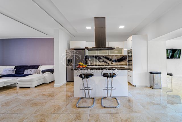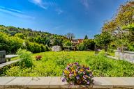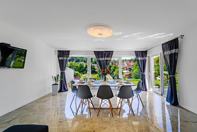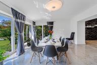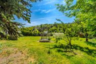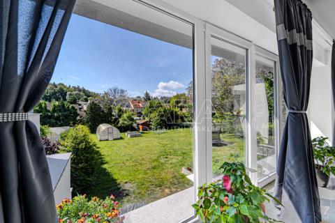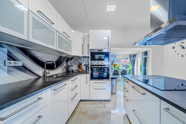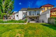 Přízemí: Ze zádveří vedou schody do suterénu a do zvýšeného přízemí. Zde se nachází prostorný obývací pokoj propojený s moderní kuchyní, velká prosluněná jídelna s nádherným a klidným výhledem do zahrady a na přilehlý les, ložnice s komorou a s přímým vstupem do koupelny vybavené sprchovým koutem a vanou, a dále samostatná toaleta.