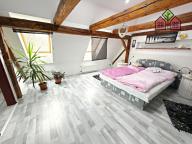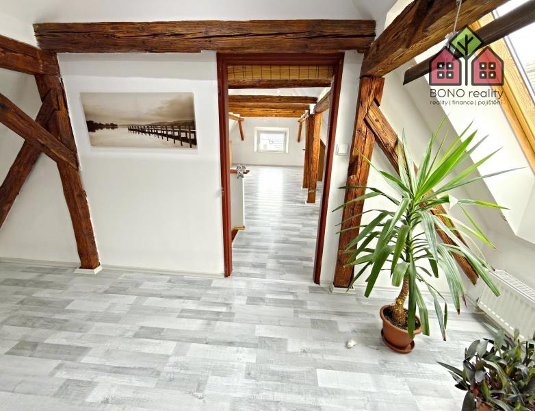 Nenápadný vstup z hlavní chodby domu Vás pak přivede dřevěným schodiště do obytného podkroví, které Vám zaručí naprosté soukromí. V pravé části podkroví je umístěna ložnice a v levé části je pak dosud nevyužitý velký prostor. Oba prostory mají přiznané trámoví a mohou opravdu splnit veškerá Vaše očekávání a přání. V podkroví jsou tedy nyní dva pokoje s připravenými rozvody elektřiny, vody a kanalizace. Prostor je však velmi variabilní, lze zde vybudovat další byt o dispozici například 2+kk, nebo až tři pokoje. Celý prostor je pak osvětlen dřevěnými střešními okny a na podlaze je položena plovoucí podlaha.