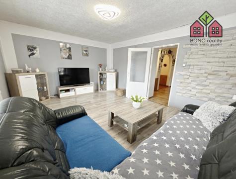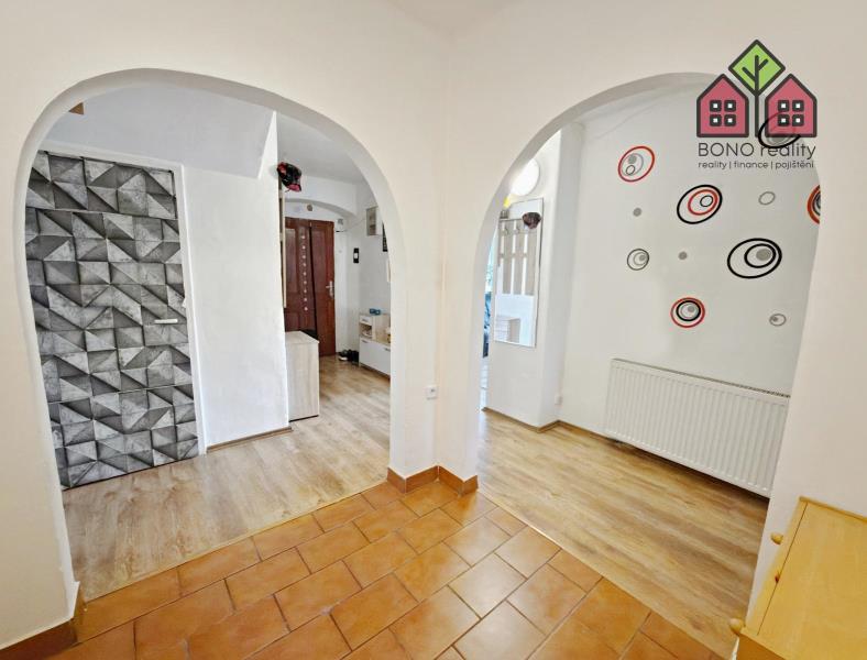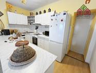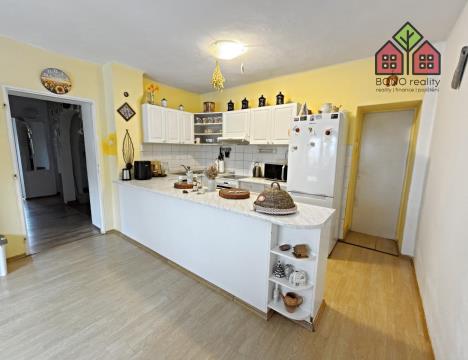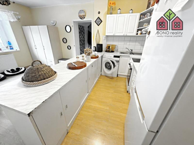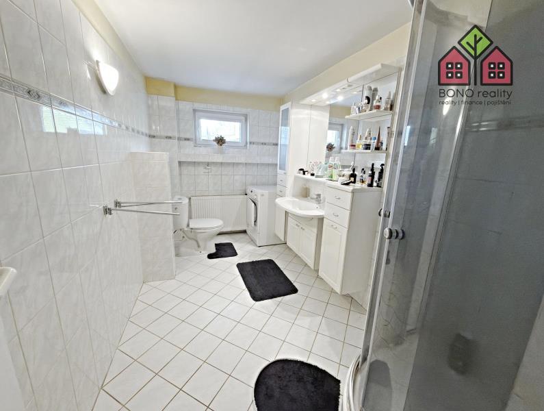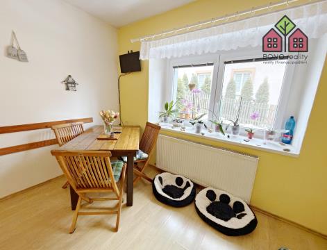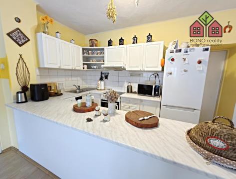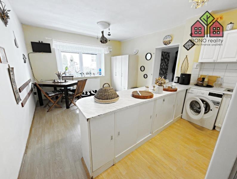 Pojďme si však nyní představit hlavní část rodinného domu o současné dispozici 5+1, kterou tvoří jedno nadzemní podlaží s obytným podkrovím. Již při vstupu do větší chodby na Vás dýchne velmi příjemná atmosféra útulného domova, neboť dům je po rekonstrukci, pečlivě udržován a stylově vybaven. Z chodby je vstup do kuchyně s jídelnou, obývacího pokoje, pokoje (nebyly pořízeny jeho fotografie z důvodu zachování soukromí vlastníka) a do koupelny s toaletou. V kuchyni je linka s velkým pracovním pultem (barový), elektrická kamna, přípojka pro automatickou pračku a místo pro lednici. U okna, s výhledem do zeleně, je pak umístěn jídelní stůl. Obývací pokoj má výměru 25,10 m2 a lze zde tedy umístit i opravdu velkou sedací soupravu, nezbytné skříňky či například počítačový koutek. Dostatek místa zde bude i pro Vaše případné domácí mazlíčky, jak ostatně i z pořízených fotografií vyplývá. Velkoryse řešena je i koupelna se sprchovým koutem, toaletní skříňkou s umyvadlem a společnou toaletou. Obložena je pak příjemným a nadčasovým keramickým obkladem. V tomto podlaží jsou osazena plastová okna a na podlaze je položena dlažba nebo plovoucí podlahy.