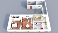 Dispozice: z předsíně (8,2 m2) se vlevo vchází do kuchyně (8,8 m2), dále do obývacího pokoje s jídelním koutem (19,2 m2) a poté do ložnice (13,7 m2), na níž navazuje praktická šatna (3,5 m2). Dále je z vstupní chodby na levé straně vstup do koupelny s WC (5,5 m2). Z předsíně se dostaneme jak na půdu, která je nad celou obytnou částí, tak i do sklepa, kde je v plánu umístění bojleru na ohřev vody a dále na konci chodby do technické místnosti k umístění kotle na tuhá paliva.