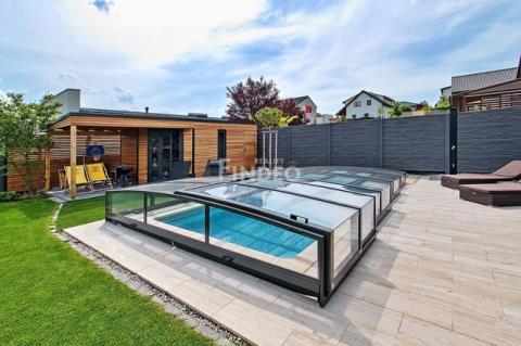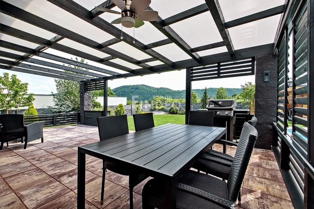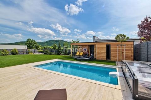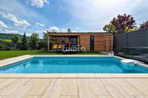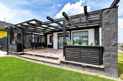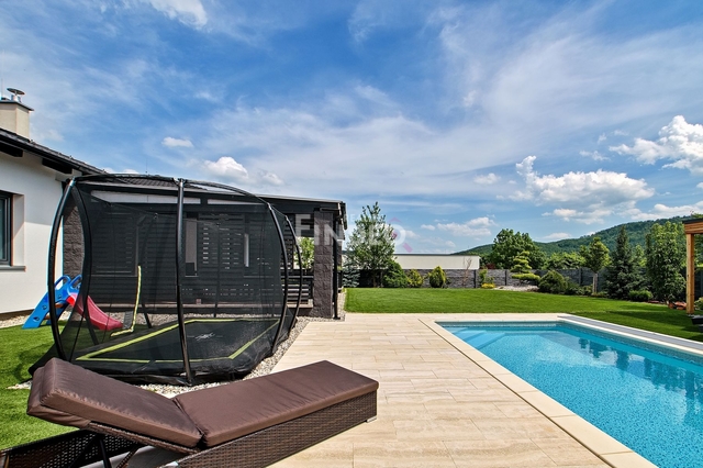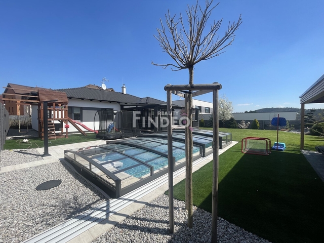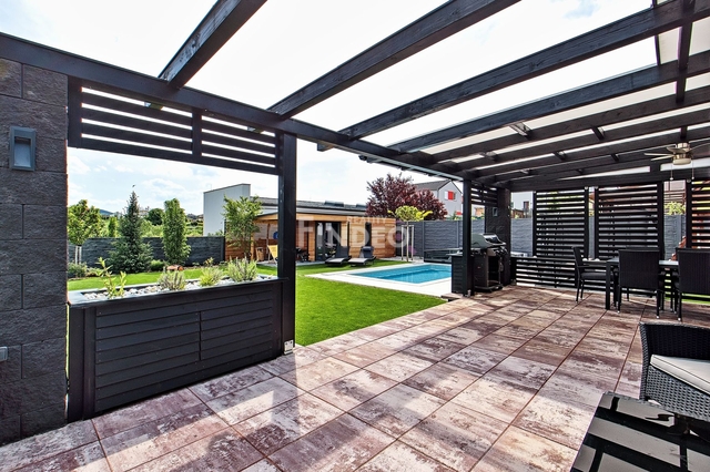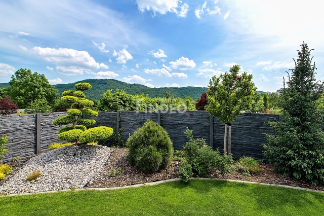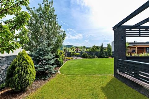 Atraktivitu domu podtrhuje nádherně udržovaná zahrada se vzrostlou vegetací. Její kondici zajišťuje zavlažovací systém, který je zvlášť na trávník a na stromky a keře a vodu čerpá z detekční nádrže na dešťovou vodu. Proto se nemusíte obávat zbytečných nákladů za zalévání záhonů a udržení stále zeleného trávníku. Pro kutily anebo pro úklid dětských hraček, slouží prostorný zahradní domek. Pomyslnou „třešničkou“ je terasa. Orientace na jih, nádherný výhled, absolutní soukromí, dostatek místa na posezení s přáteli např. u grilovačky a v nepřízni počasí možnost se ukrýt v zastřešené části. Absolutní idylka, které žádný zájemce neodolá.