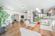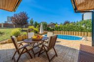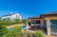 Dispozičně dům nabízí tři ložnice, prostorný obývací pokoj s kuchyňským koutem, koupelnu s vanou, sprchovým koutem a dvěma umyvadly, samostatné WC s malým umyvadlem, technickou místnost a vstupní zádveří. Obývací pokoj má dvě prosklené stěny orientované na jih, které zajišťují dostatek denního světla a přímý vstup na terasu a k bazénu. Kuchyňská linka je vyrobena na míru a vybavena granitovým dřezem, indukční varnou deskou, elektrickou a mikrovlnnou troubou, digestoří a myčkou. V pracovně a ložnici se nacházejí vestavěné skříně s dostatkem úložného prostoru. Předsíň poskytuje přístup na půdu, která slouží pro skladování. V obytných místnostech je položena kvalitní vinylová podlaha, v koupelně, WC, technické místnosti a zádveří je keramická dlažba.
