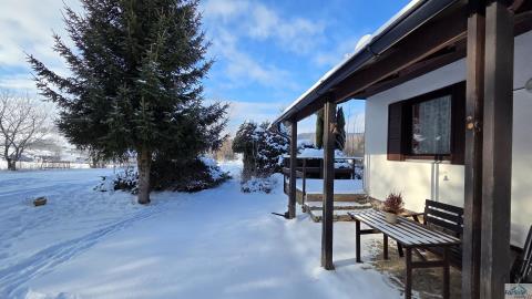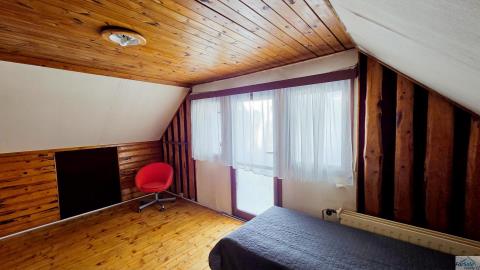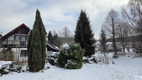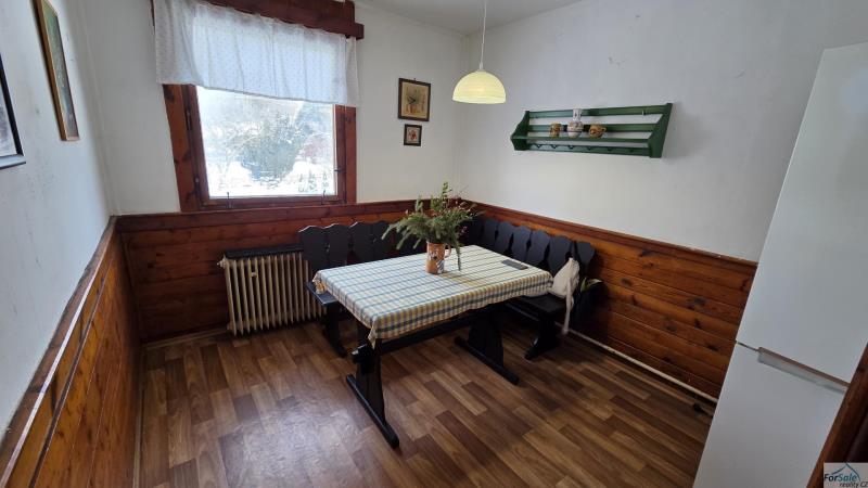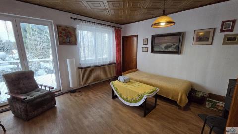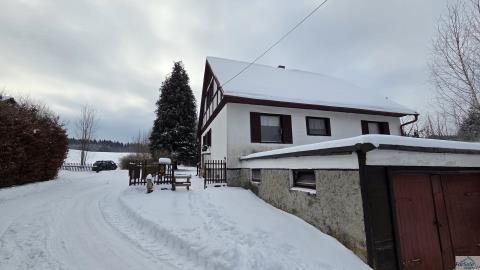 Rovinatý pozemek o celkové užitné ploše cca 1700 m tvoří z jedné větší části udržovaná zahrada, z druhé části lesík. Samotný dům je typově Okál z 80 let v zachovalém, ale původním stavu s drobnými úpravami, dispozičně 4+1 s terasou, lodžií, vstupem do garáže a podsklepením v pískovci, obytná plocha cca 130 m. V přízemí vstupní chodba s komorou, kuchyně s jídelnou, koupelna, samostatné WC, obývací pokoj se vstupem na terasu, ložnice a menší hala se vstupem do sklepa, garáže a schodiště do podkroví. V podkroví dva obytné pokoje, jeden s lodžií s výhledem do krajiny, samostatné WC. Dům napojen na kanalizaci, vodovod, elektřinu, vytápění řešeno ústředním topením s kotlem na tuhá paliva (nutná výměna) a novými krbovými kamny v obývacím pokoji, teplá voda z elektrického bojleru. Pokud hledáte klidné klidné místo a soukromí pro rodinné bydlení či rekreaci, neváhejte si dojednat osobní prohlídku. Nemovitost ihned volná, funkční a bez jakýchkoliv dluhů či závazků. Cena včetně provize RK a právního servisu.