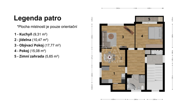 o První patro: Byt 3+1 o výměře přibližně 78 m², který byl před cca 25 lety zrekonstruován. Zahrnuje kuchyň, spíž, jídelnu, ob. pokoj s krbovými kamny, ložnici se zaskl. balkonem, komoru a koupelnu s vanou, sprch. koutem a s toaletou.