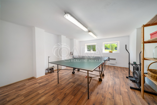 o Suterén: Zahrnuje garáž s vraty na dálkové ovládání, místnost s pingpongovým stolem, toaletu, velkou dílnu s domácí vodárnou a původně prádelnu s umyvadlem používanou na uložení zahradního nářadí.