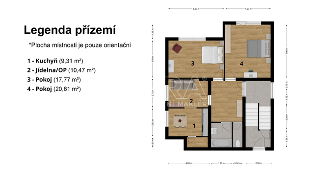 o Zvýšené přízemí: Byt 3+1 o výměře přibližně 78 m², vhodný k renovaci. Sestává z kuchyně, spíže, jídelny, 2 pokojů, koupelny a toalety.