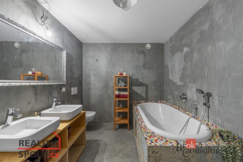 -dům, který má styl: kombinace přiznaného betonu, dřeva a barevných detailů vytváří originální atmosféru. Dispozičně je to 4kk s praktickou šatnou a technickou místností se sprchou pro očistu miláčka. Ať už jím je čtyřnohý kamarád nebo milované kolo. Podlahová plocha přízemí 129 m²