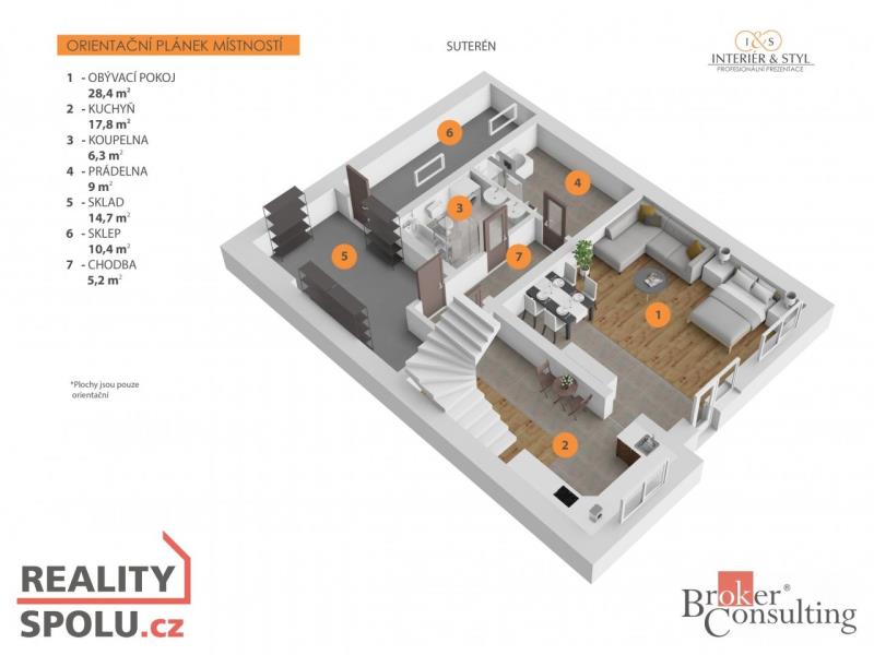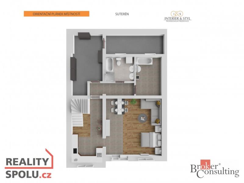 Vstup z ulice, kde je i garáž a kryté parkovací stání, je do II. NP, kde se nachází předsíň, samostatné WC s umyvadlem, kuchyň, komora, obývací pokoj se vstupem na balkón a ložnice. Z předsíně je vstup do obytné části nebo na centrální schodiště, kudy můžete jít dále do I. NP nebo do obytného podkroví. V obytném podkroví se nachází 3 pokoje a koupelna s WC.