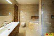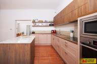 V patře pak máte k dispozici tři neprůchozí dětské pokoje, koupelnu, ložnici rodičů s vlastní koupelnou a klimatizací, v prostorné obývací hale s trámovým stropem a vstupy na dva balkony je ještě prostor na společné posezení nebo knihovnu se čtecím koutkem.