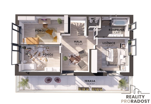 Ložnice (19,8 m²), pokoj (17,5 m²), pokoj (20,3 m²), hala (18,9 m²), koupelna (9,4 m²), WC (2,2 m²).