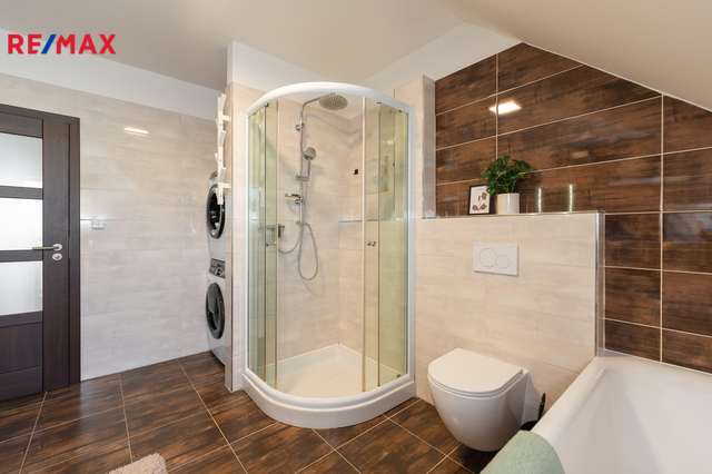 -v každém patře plnohodnotná koupelna, dole sprchový kout, nahoře sprchový kout i vana.