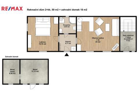 Technická místnost a vstup do podkroví jsou přístupné samostatně z venku. Podkroví nabízí možnost vybudování půdní vestavby.