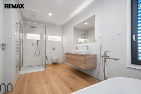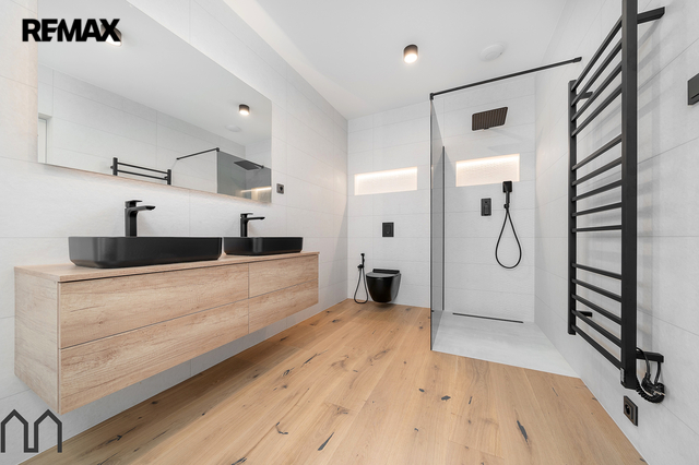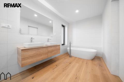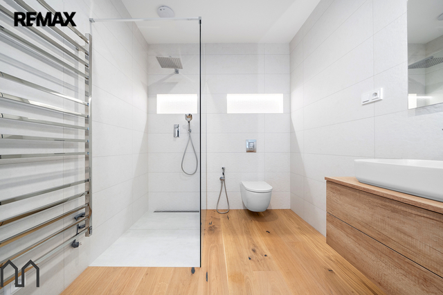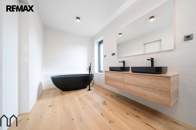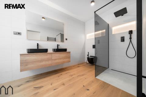 Interiér je zpracován ve vysokém standardu – koupelny s designovou sanitou, podsvícenými zrcadly a moderními obklady vytváří dojem skutečně prémiového bydlení.