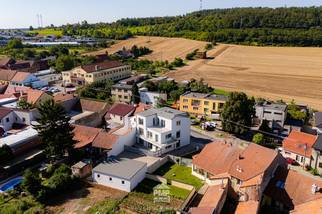 Nabízíme Vám ke koupi novostavbu rodinného domu se třemi bytovými jednotkami, třemi garážemi a venkovním parkovacím stáním v obci Nebovidy. Projekt byl zkolaudován v září 2025 a realizován pod dohledem nezávislé společnosti DEKPROJEKT s.r.o., která v průběhu stavby prováděla technické kontroly. Díky tomu poskytujeme záruku 4 roky na stavbu od převzetí nemovitosti. Celý dům byl navržen a realizován s důrazem na kvalitu provedení, důmyslné detaily a technické vychytávky, které ocení každý, kdo chce bydlet bez kompromisů. V oblasti technologií projekt nabízí moderní a úsporná řešení: centrální vytápění a ohřev vody zajišťuje tepelné čerpadlo NIBE (vzduch–voda), podlahové vytápění se nachází ve všech místnostech. Byty v 2. NP a podkroví jsou vybaveny klimatizačními jednotkami (byt v přízemí má připravené rozvody). Každý byt má vlastní datový rack s možností volby typu připojení a v domě je již připravena přípojka na optický kabel. Nechybí ani příprava na fotovoltaiku a využití dešťové vody pro ekologické splachování WC. Úložné prostory jsou navrženy tak, aby pojali kola, motorky, kočárky nebo lyže. Přízemní bezbariérový byt 3+kk (90 m²) nabízí přímý vstup na terasu se zahrádkou o velikosti cca 51 m². Je ideální pro rodiny s dětmi, starší osoby nebo kohokoliv, kdo ocení vlastní kousek zeleně. Byt v druhém nadzemním podlaží (4+kk, 101,7 m²) je největší z celého domu. Jeho interiér byl navržen architektonickou kanceláří, je kompletně zařízený nábytkem na míru a připravený k nastěhování. Součástí je L-balkon o velikosti 19 m². Třetí byt se nachází v podkroví a má dispozici 3+kk (76,7 m²). Nabízí rozlehlou rohovou terasu s výhledem na obec a okolní přírodu.