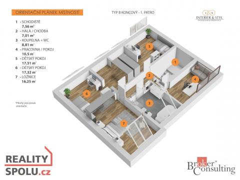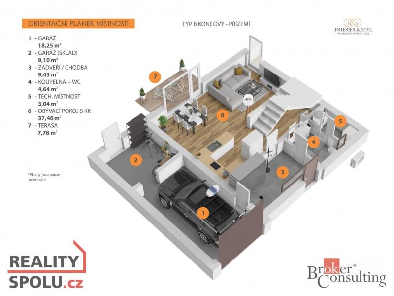 ENGLISH BELOW S radostí Vám představujeme dům typu B (koncový) v exkluzivním projektu řadových rodinných domů v Ořechu u Prahy. Projekt Kalinova zahrada (web kalinovazahrada) představuje velkorysé moderní rodinné domy na prahu metropole. Komfortní bydlení v oáze klidu a zároveň s výborně dostupným centrem Prahy může být jasnou volbou pro váš rodinný život i lukrativní investiční příležitost. V osobitém pojetí kombinuje komplex Kalinova zahrada klasiku s moderním designem. Během tří etap se ve třech liniích 5, 6 a 7 řadových domů zrodí nová, příjemně a harmonicky působící čtvrť s celkem 18 dvoupodlažními rodinnými domy. Nabídka více typů rodinných domů Kalinova zahrada díky různým dispozicím vyhoví rozmanitým požadavkům svých klientů. Prostorné bydlení s dispozicemi 3+kk, 4+kk, 5+kk či 6+kk a celkovou plochou od 147 m2 do 170 m2 je i díky výborné občanské vybavenosti a dostupnosti metropole mimořádně atraktivním zejména pro rodiny s dětmi či partnerské dvojice s nároky na vyšší životní standard. Kalinova zahrada odhaluje významný potenciál obce Ořech u Prahy. Na jihozápadním okraji české metropole se z malebné vsi s dávnou historií rodí atraktivní, vyhledávaná lokalita s vkusně vyhlížející rodinnou zástavbou plnou života i společenského dění a zároveň s bezkonkurenční občanskou vybaveností hlavního města Prahy nadosah. Těšíme se na setkání s Vámi při osobní schůzce nebo prohlídce nemovitosti. ENGLISH We are pleased to present type B (end of the block) house in an exclusive project of terraced houses in Ořech u Prahy. The Kalinova zahrada project (web kalinovazahrada) presents generous modern family homes on the doorstep of the metropolis. Comfortable living in an oasis of calm and at the same time with excellent access to the center of Prague can be a clear choice for your family life as well as a lucrative investment opportunity. In a unique concept, the Kalinova zahrada complex combines classics with modern design. During three stages, a new, pleasant and harmonious district with a total of 18 two-story family houses will be born in three lines of 5, 6 and 7 terraced houses. Kalinova zahradas offer of several types of family houses, thanks to its various layouts, meets the diverse requirements of its clients. Spacious housing with layouts of 3+kk, 4+kk, 5+kk or 6+kk and a total area from 147 m2 to 170 m2 is extremely attractive, especially for families with children or couples with demands for a higher standard of living, thanks to the excellent civic amenities and accessibility of the metropolis. The Kalinova zahrada reveals the significant potential of the village of Ořech u Prahy. On the south-western edge of the Czech capital, a picturesque village with a long history has given birth to an attractive, sought-after locality with a tasteful-looking family building full of life and social events, and at the same time with the unrivaled civic amenities of the capital city of Prague within easy reach.