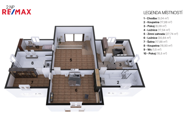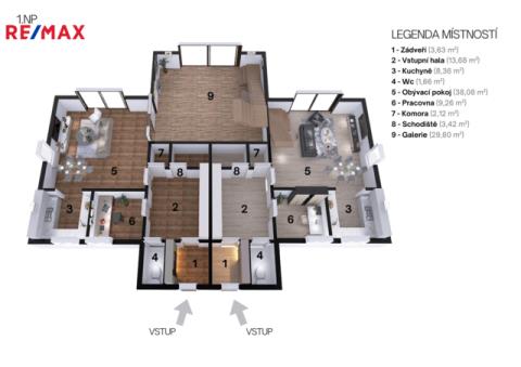Do domu vstupujeme přes zádveří do vstupní haly, z níž vcházíme jak do pracovny, komory, WC a na schodiště do garáže, tak i do hlavní denní části domu. Tou je prostorný obývací pokoj s krbem, útulnou kuchyní na míru, včetně kvalitních spotřebičů, a navazující vzdušná zimní zahrada. Z ní se po schodech dostaneme do 2. NP, kde se nachází ložnice, luxusní koupelna se samostatnou toaletou, šatna a další pokoj. V suterénu domu se dále nachází garáž, kotelna, sklad a schodiště do přízemí. Vjezd do dvojgaráže je zabezpečen dálkově ovládanými vraty.