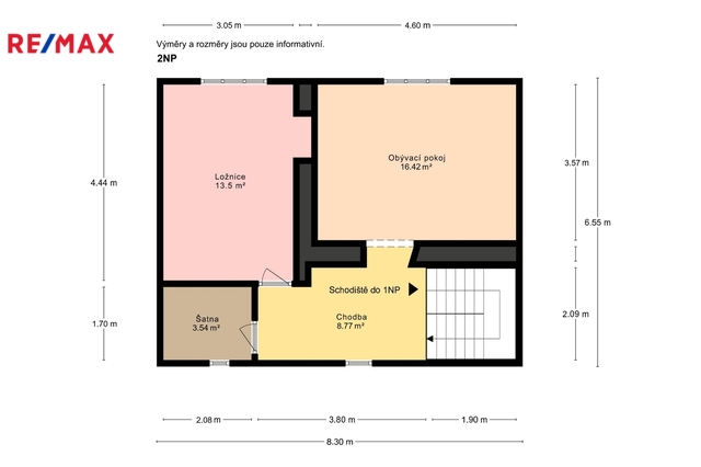 Do domu se vstupuje přes prostornou vstupní halu (19 m²), odkud se vchází hlavními dveřmi do obytné části. V přízemí se nachází předsíň (6,2 m²), kuchyně (14 m²) a koupelna (8,2 m²). V patře je prostorná chodba (8,77 m²), ložnice (13,5 m²), obývací pokoj (16,42 m²) a šatna (3,54 m²).