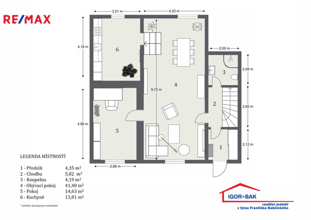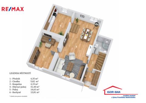 V prvním nadzemním podlaží se nachází prostorný obývací pokoj s jídelnou (41,40 m²), který tvoří hlavní obytnou část domu. Na obývací pokoj navazuje kuchyň (13,81 m²) s přímým vstupem na terasu o velikosti 11,89 m², jež poskytuje příjemné propojení interiéru se zahradou. Přízemí doplňuje ložnice (14,63 m²), koupelna (4,19 m²) s přípravou na sprchový kout a pračku, chodba (5,82 m²) a zádveří (4,35 m²).