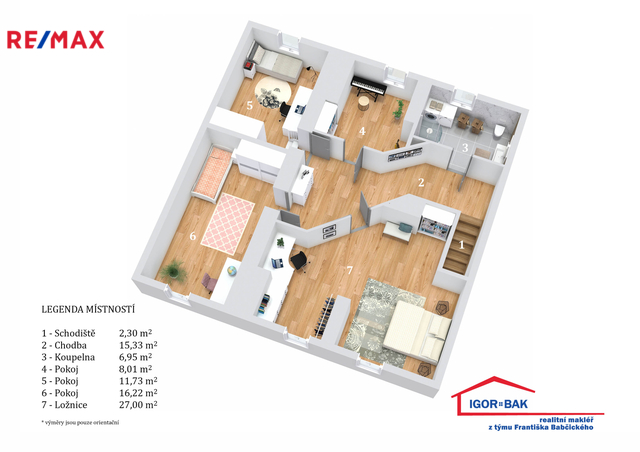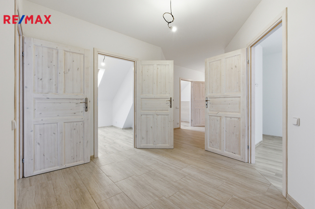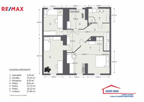 Ve druhém nadzemním podlaží se nacházejí čtyři pokoje o výměrách 27,00 m², 16,22 m², 11,73 m² a 8,01 m². Patro dále nabízí koupelnu (6,95 m²) s přípravou na vanu, prostornou chodbu (15,33 m²) a schodiště (2,30 m²). Celé horní podlaží působí vzdušně a poskytuje dostatek prostoru pro vícečlennou domácnost, dětské pokoje, pracovny či hosty.