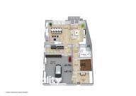 • 1. NP (Společenské patro): dominantou je obývací pokoj se zabudovaným promítacím plátnem, stolem pro 8 osob a vstupem na zahradu. Kuchyně je vybavena spotřebiči Miele, žulovou pracovní deskou a dvojlednicí Liebherr s vinotékou, granitovým dřezem Franke a drtičem na odpad. Parní trouba i lednice jsou napojeny na vodu (výrobník ledu).