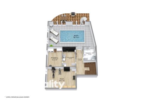 • 1. PP (Relaxace a zázemí): Suterén nabízí technické zázemí, dílnu, sklad, koupelnu s toaletou a prádelnu se shozem prádla a prostor připravený pro vnitřní bazén nebo wellness se saunou a přímým vstupem na terasu.