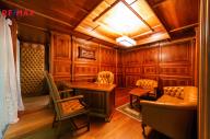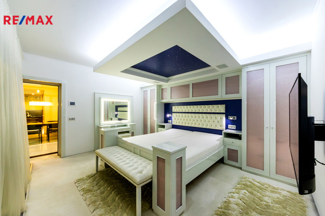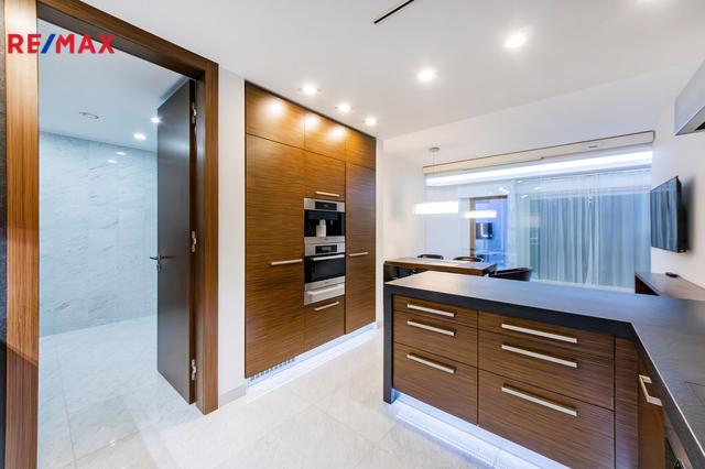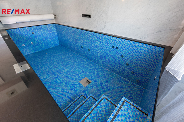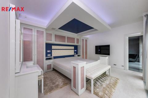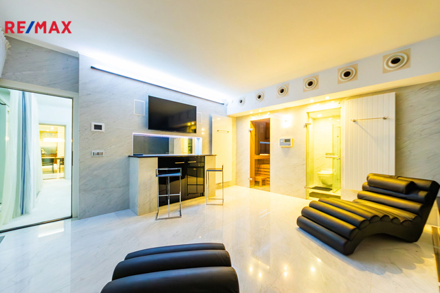 Kuchyňská linka, vybavena spotřebiči zn. Miele včetně elektricky výsuvných šuplíků, navazuje na obytný prostor, ve kterém je obývací stěna na dálkové ovládání, mramorový elektrický krb, který hřeje i praská. Dominantou ložnice je hvězdné nebe z optických vláken + koupelna Swarovski. Ve wellness části je bazén s tryskami a masážním vodopádem, sauna s dvojsystémem (pára a suchá), muzikoterapie, bar s lednicí (možnost nasvícení čtyřmi barvami).