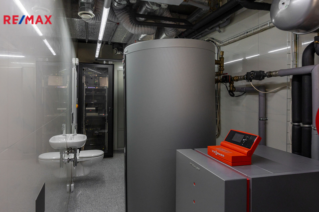 Čerstvý vzduch zajišťuje rozvedená rekuperace s chladící jednotkou, topení kotlem Viessmann zajišťují 3 stometrové vrty tepelného čerpadla pro dům i pro bazén.